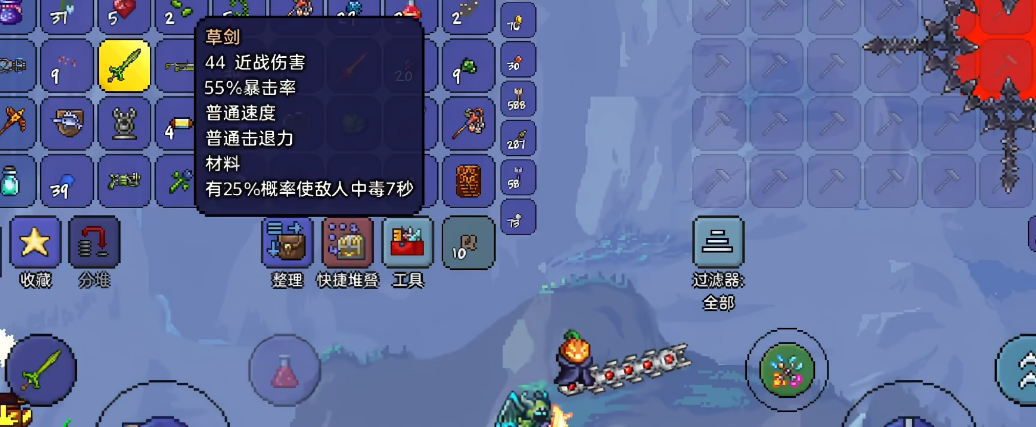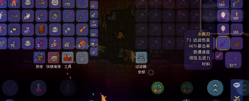 合成地点是关键,恶魔祭坛通常生成在腐化之地,猩红祭坛则在猩红之地。如果地图生成的是腐化地形,必须使用血腥屠杀者;若是猩红地形,则可用魔光剑替代。找到祭坛后打开合成菜单,将四把武器放入即可获得永夜之刃。它的基础伤害为42,攻速较快,挥动时附带微弱光效,是过渡到困难模式的重要装备。