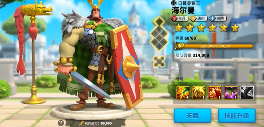 海尔曼作为万国觉醒中的史诗级弓兵统帅,其核心价值体现在野战与特定场景的战术压制能力。一技能伏军可造成高额伤害(觉醒后系数1150),同时减少目标100怒气并附加2秒沉默效果,这一机制在对抗依赖技能输出的武将时具有显著优势。二技能军事天才提升弓兵10%攻击力与行军速度,强化了部队的机动性与输出能力。三技能条顿堡传奇虽提供驻防加成,但实际应用中优先级较低,因孙武等武将更适合驻防角色。四技能民族英雄进一步增加普攻伤害与怒气回复概率,配合觉醒技绝境之缚可形成持续压制。