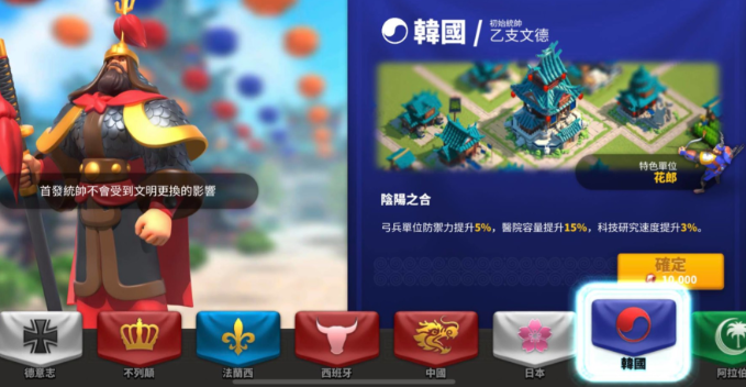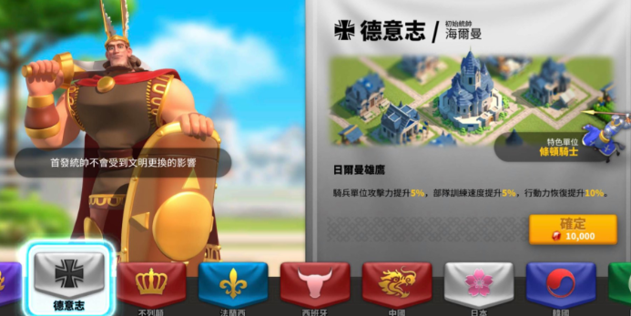 更换文明后,不同文明的加成效果会影响你的发展路线。比如零氪或微氪玩家如果追求科技解锁速度,可以选择韩国文明;如果更看重兵种属性加成,罗马、法国、德国或阿拉伯文明会更合适。弓兵在前期对资源要求较高,不太推荐平民玩家主玩。中后期玩家如果已经解锁T4科技甚至部分T5兵种,可以根据兵种偏好调整文明,比如骑兵选德国,步兵选罗马或法国,弓兵则适合中式。