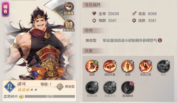 潘凤作为三国志幻想大陆中极具特色的突击型武将,凭借其高爆发真实伤害和独特的沉默机制,在阵容搭配上拥有极高的战术价值。其核心优势在于怒攻后触发的沉默状态被驱散或结束时能立即回复1000点怒气,从而实现单回合多次怒攻的爆发效果。要最大化潘凤的输出能力,需围绕其技能特性构建阵容,优先选择能提供驱散、怒气回复及生存保障的辅助武将,同时搭配羁绊伙伴邢道荣以激活伤害加成效果。