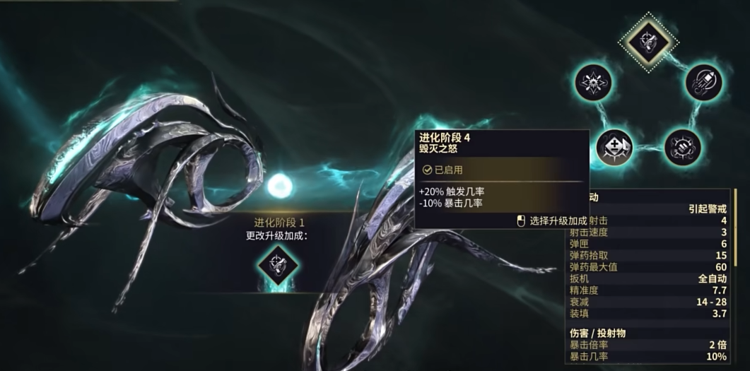 灵化进化路线对逐枭性能影响显著,推荐选择灵化形态、顺滑飞行、装载动能、毁灭之怒及毁灭损耗的组合。顺滑飞行和装载动能能显著改善武器射速与弹道稳定性,而毁灭之怒和毁灭损耗则通过牺牲少量暴击几率换取更高的状态触发与暴击伤害加成。该进化路线使逐枭在灵化模式下兼具爆发与持续输出能力,尤其适合中近距离作战。需注意灵化充能需通过爆头积累,激活后需合理利用双持形态的高机动性。