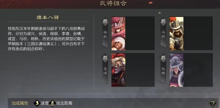 旗本八骑是一组特殊的四星骑兵武将组合,由梁兴、侯选、程银、李堪、张横、成宜、马玩、杨秋八名武将中的任意三位组成。这一组合的核心优势在于其极高的行军速度加成,称号效果可提供69点速度加成和1点攻击距离提升,使其成为游戏中最快的铺路队之一。在30级白板状态下,配合主城建筑加成,旗本八骑的行军速度轻松突破200点,远超多数五星骑兵。