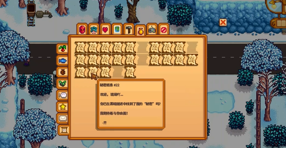 秘密纸条系统是触发隐藏剧情的关键。玩家在冬季获得放大镜后,可通过击败敌人或挖掘矿物获取这些纸条。其中第23号纸条提示玩家在早上6点至晚上7点间前往秘密森林,将枫糖浆交给熊后获得熊的智慧奖励。另一张纸条则指向三个隐藏雕像的获取方式:将大海参放入铁匠铺北部栅栏内的箱子、鸭蛋黄酱放入酒吧后屋的紫色桶中、奇怪的小面包放入文森特房间的玩具箱。
