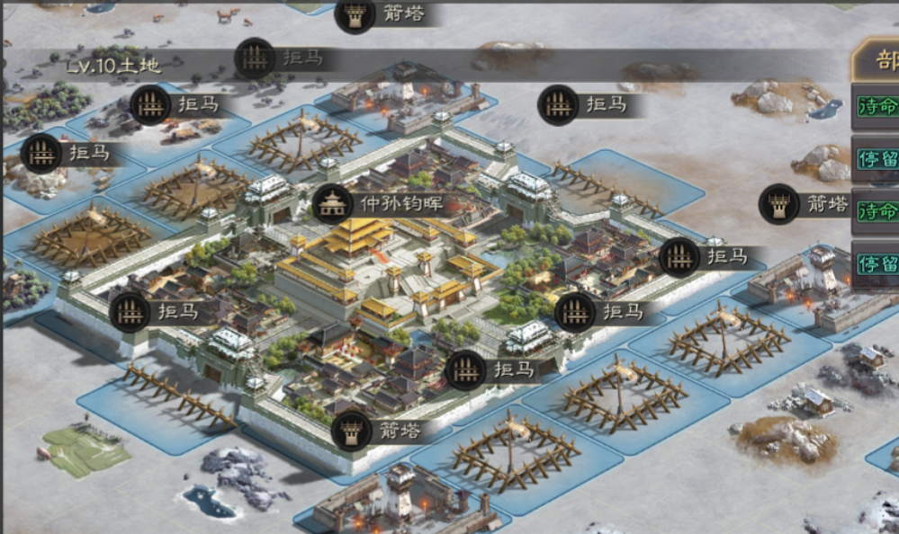 有效的防守工事布阵是巩固领土的关键。拒马和箭塔是核心防御建筑,拒马能阻挡非友好同盟部队行进,迫使其拆除或回城;箭塔提供两格视野并对进入相邻土地的敌军发起攻击。建造拒马和箭塔需工事营达到1级,而工事营解锁需君王殿升至4级。防御工事的等级直接影
