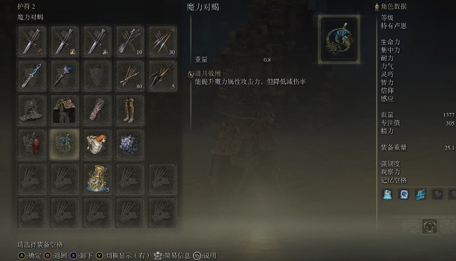 中期阶段需重点获取陨石杖、卡利亚权杖等核心装备,其中陨石杖要求智力18点且自带S级补正,是过渡到中期的关键武器。集中力提升至30时可解锁更多记忆格位,搭配辉石魔砾等基础法术已能应对大部分场景。建议保持智力与集中力2:1的加点比例,同时将生命力逐步提升至25-30区间,确保探索时的容错率。