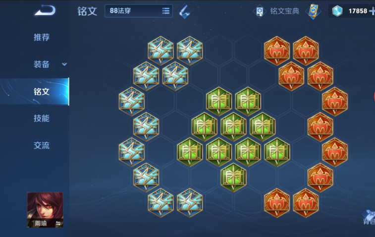 说完出装,铭文的搭配也同样关键,它决定了你游戏前期的战斗力。对于周瑜来说,铭文属性的优先级是法术穿透、法术吸血和冷却缩减。一套非常适合他的五级铭文搭配是:红色选择十个梦魇,提供法术攻击和穿透;绿色选择十个献祭或者怜悯,献祭提供法术攻击和冷却缩减,怜悯则提供更高的冷却缩减;蓝色选择十个贪婪,提供法术吸血。这样搭配下来,你开局就能有不错的法伤、穿透和续航能力,清兵线和消耗对手都会很舒服。如果你铭文碎片不够,用四级铭文过渡也可以,比如红色阳炎、绿色侵蚀和蓝色渴血,主要凑法术攻击和穿透。