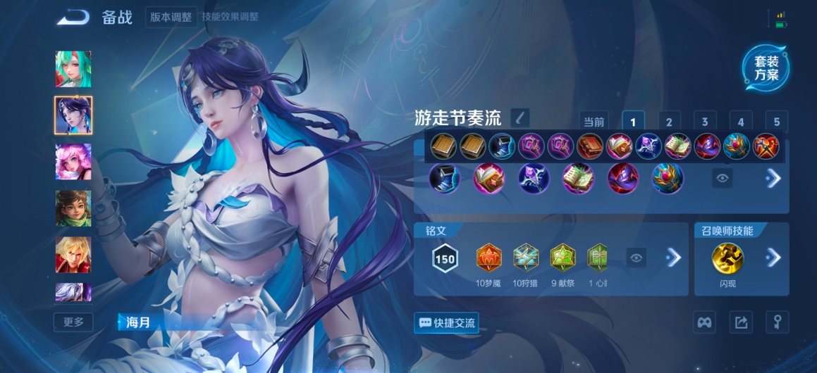 海月的出装可以灵活调整。爆发输出流推荐冷静之靴、日暮之流、回响之杖、噬神之书、博学者之怒和贤者之书,这套方案前期注重固定法穿和冷却,中期通过噬神之书增强续航,后期高法强能快速秒掉脆皮。续航消耗流则是在冷静之靴基础上加入噬神之书和虚无法杖,提高吸血能力和生存空间,适合面对坦克阵容或持久战。