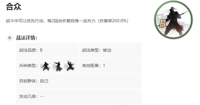 合众战法是一种被动战法,能够在战斗中提供先手行动和每两回合回复自身兵力的效果。这种战法适合放置在前锋或中军位置,因为先手效果能让你更快释放技能,抢占战斗先机,而回复效果虽然不算特别强,但胜在稳定,能帮助续航更久。合众战法的优势在于它是被动触发,不会被控制技能打断,所以稳定性很高,尤其适合喜欢玩快攻或者需要先手控制的队伍。