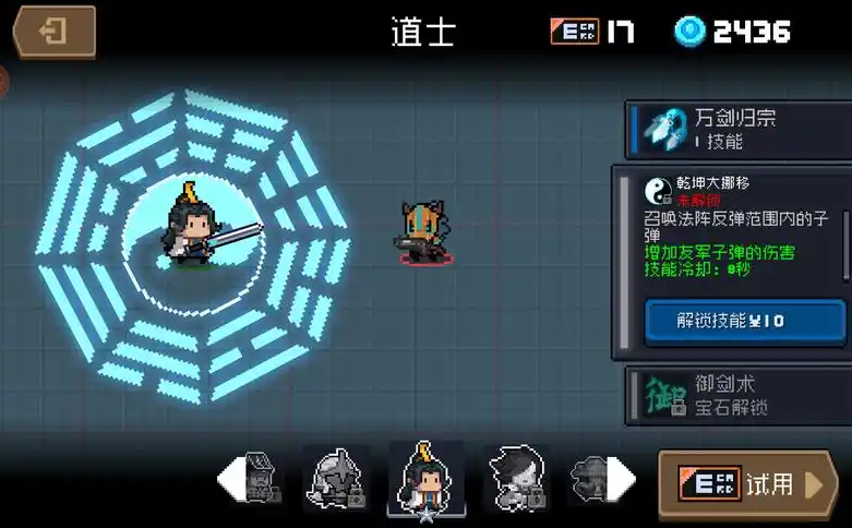 道士的一技能万剑归宗能召唤飞剑环绕周身并自动追击敌人,是主要的清场手段。由于飞剑属于近战攻击且能抵消子弹,适配天赋应以减CD类为主,例如沙漏天赋能将冷却缩短至五秒,从而更频繁地发动攻击。防御型天赋如蓝盾、火盾和毒盾也非常关键,能有效弥补道士生存能力的不足。散弹加成天赋虽可增加飞剑数量,但实际稳定性不如直接提升生存能力的天赋。该技能在近距离能造成爆发伤害,但对单体BOSS的命中效率较低,更适用于对付杂兵。