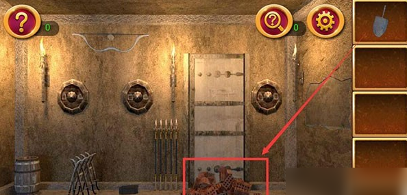 到了第六关,环境会变成一个像是古代兵械库的房间,里面摆放着各种冷兵器,通关的核心思路就是找到房间里散落的工具部件,把它们组合成有用的道具,最后解开一个需要射箭的机关。进入这一关,你首先会看到地上有一堆砖块,旁边靠着一把铲子,直接点击就能拿到它。接着把目光转向房间左边,那里有一个摆放武器的刀架,走过去点击它,仔细查看,你能从刀架上拿到一把小刀,同时在地上发现一个锤头。这样,你手里就有了最开始收集到的几样基础物品。