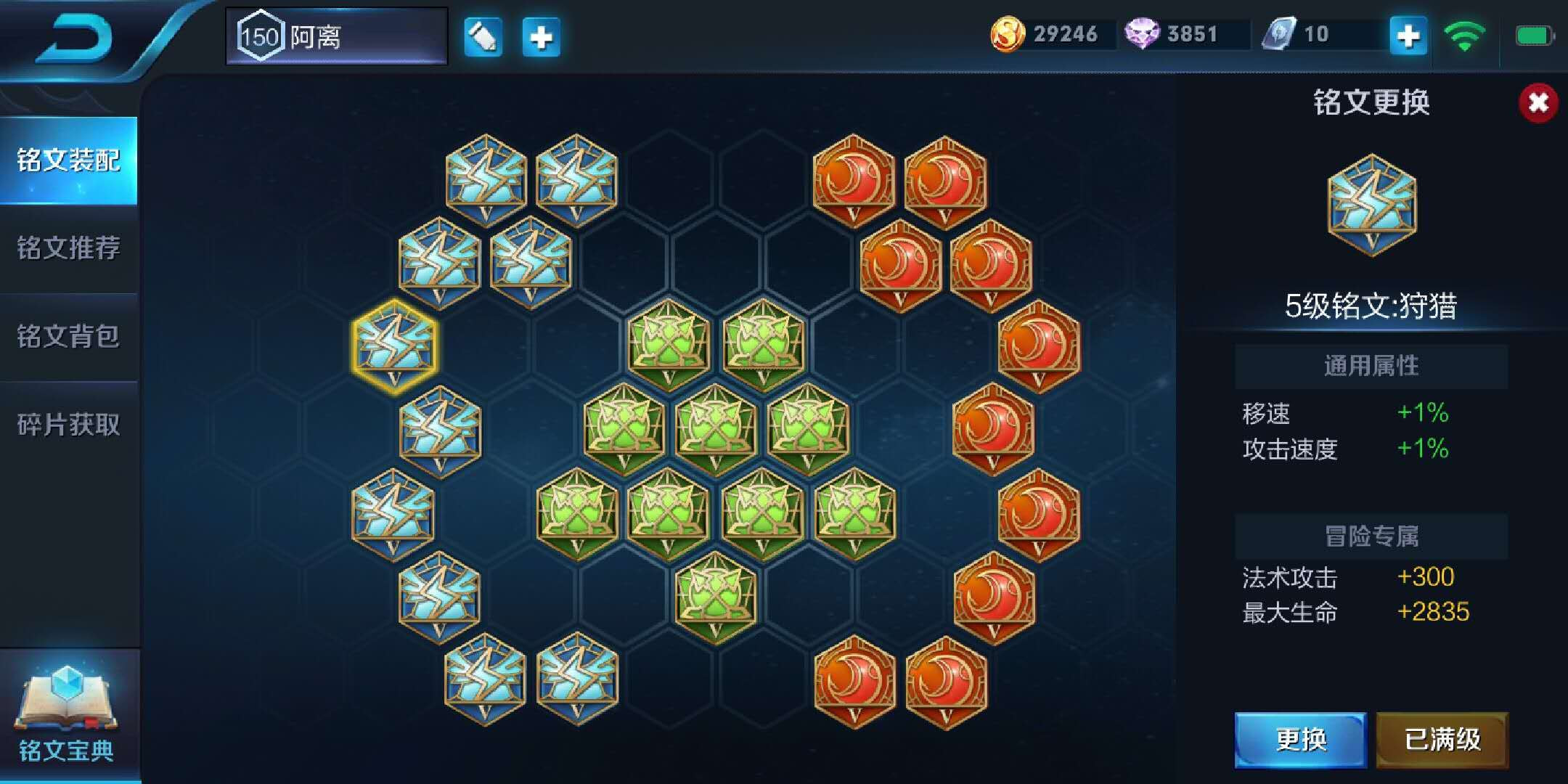 铭文搭配对公孙离的出装效果有重要影响,推荐使用红月、鹰眼和狩猎的组合。这套铭文能提供攻速、暴击率和物理穿透,让阿离在前期对线时就具备压制力,配合灵活的位移技能可以频繁消耗对手。红色铭文红月增强攻速和暴击,绿色鹰眼提升穿透,蓝色狩猎补充移速和攻速,确保她在不同时期都能发挥稳定作用。