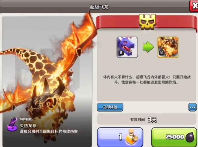 火龙的练级是一个系统性的过程,其核心前提在于确保进攻科技建筑的优先升级与稳定的资源获取。想要有效提升火龙的等级,你必须首先关注实验室的升级,因为这是研究所有兵种新等级的关键设施,若实验室等级滞后,你将无法解锁火龙更强的形态。在升级大本营后,应优先使用建筑之书或锤子等道具秒升实验室,以确保兵种升级路线不被卡住。紧你需要保障资源建筑的等级,升级圣水瓶和金库以容纳更多资源,同时持续投资圣水收集器和金矿来获得稳定的资源收入,这是支撑后续长期升级的经济基础。部落城堡的升级也不容忽视,它能提供更强的援军支持,为你的进攻创造更好条件。在资源规划上,应将火龙升级所需的大量圣水资源列为优先支出项,避免因资源短缺而中断升级进程。