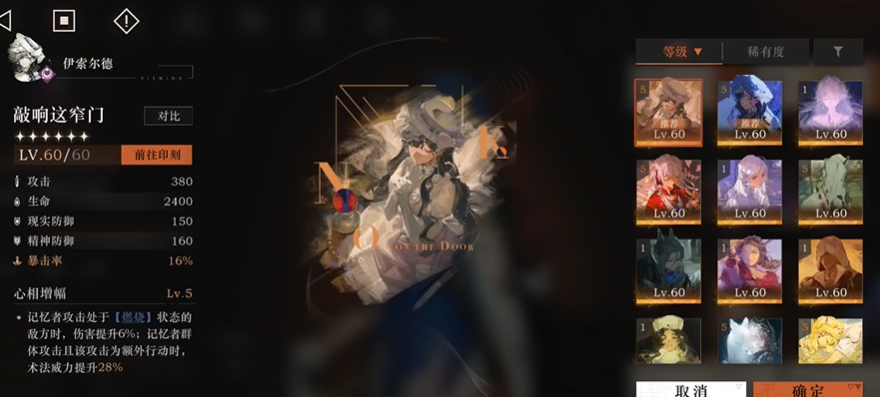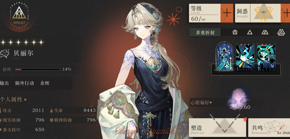 对于伊索尔德的养成,心相和共鸣的选择至关重要。心相方面,优先选择与其机制高度契合的无意识梦魇,它能提升对燃烧状态敌人的伤害,并基于余辉值为全队提供增益。敲响这窄门则是偏重输出的另一个优秀选择,能提升暴击率。共鸣摆放则推荐提升攻击与暴击属性的赤诚频段,以最大化她间奏曲技能的伤害。塑造方面,零塑的伊索尔德机制已经完整,足以胜任余辉队核心拐的职责,高塑造主要提升的是个人伤害上限。
