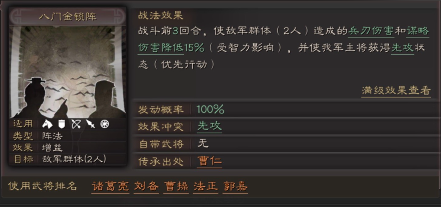 战法的选择对曹仁的功能性有显著影响。除了自带战法,为他搭配其他防御或控制类指挥战法能进一步强化其团队作用。唇枪舌战这类战法可以与其嘲讽机制形成联动。曹仁的传承战法八门金锁阵是一个极具战略价值的战法,能在战斗前三回合降低敌军群体伤害并使我军主将获得先攻,但其获取需要消耗一张曹仁卡牌。玩家需根据自身卡池深度慎重决策,若已拥有其他优质防御武将或急需该战法,则可考虑拆解;若曹仁是队伍中不可或缺的防御核心,则应保留武将本体。