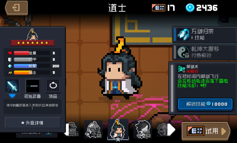 道士角色拥有独特的核心天赋御剑,这个天赋决定了其玩法与其他职业截然不同。当武器处于副手位置时,会自动悬浮在空中攻击敌人,不消耗任何蓝量,但攻击速度会明显变慢。在武器选择上应优先考虑高伤害或范围型装备,以充分利用浮游武器的特性。道士的基础属性