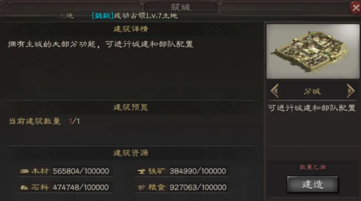 分城建设完成后需重点发展资源建筑与军事设施。资源建筑升级后的产出效益显著,特别是铜币产能对长期发展至关重要。军事方面需建设兵营、校场提升部队战斗力,同时利用分城的防御加成特性,在战略要地形成防御节点。虽然分城会清空建设地块的原有产出,但通过合理规划建筑布局和资源调配,分城最终能提供相当于6.5个十级资源地的综合收益,这种长期价值远超短期损失。