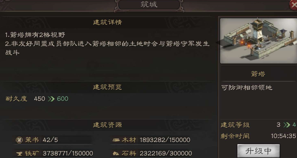 拆除箭塔的核心难点在于守军与耐久度双重机制。箭塔创建后会自动生成守军部队,其兵力随箭塔等级提升而增加,五级箭塔守军可达2100兵力。清除守军后还需消耗体力攻打耐久度,单个箭塔通常拥有约800点耐久值。主力部队的攻城值普遍在100点左右,这意味着需要组织多支队伍轮流进攻才能高效拆除,单支队伍单独作业将消耗过多体力且效率低下。