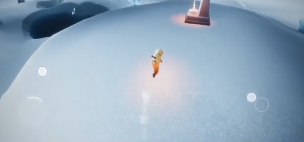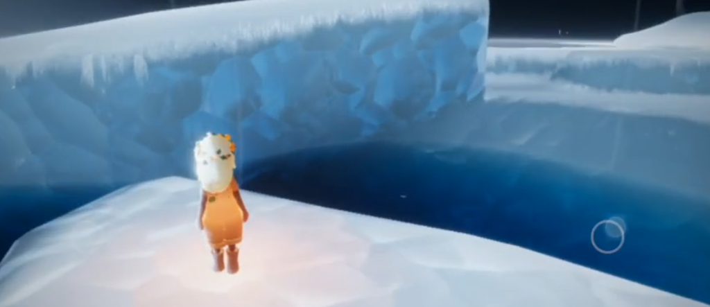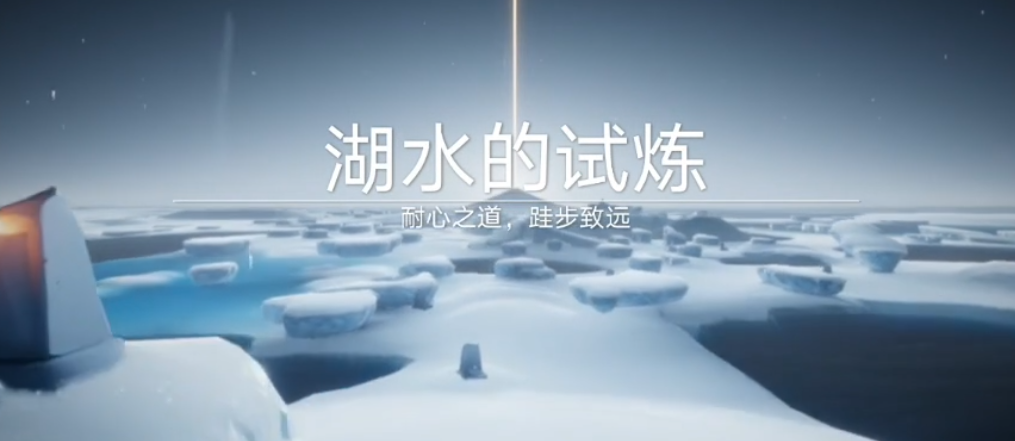 最后一段路要面对一个大冰川,先站在高处等湖水退潮,然后看准时机跳下去,落地时刚好水就退了。往前走会看到一个黑色石头,点燃它就能激活最后的机关。这时候就可以去终点的雕像前打坐,获得无敌buff后直接滑行到光翼那里。