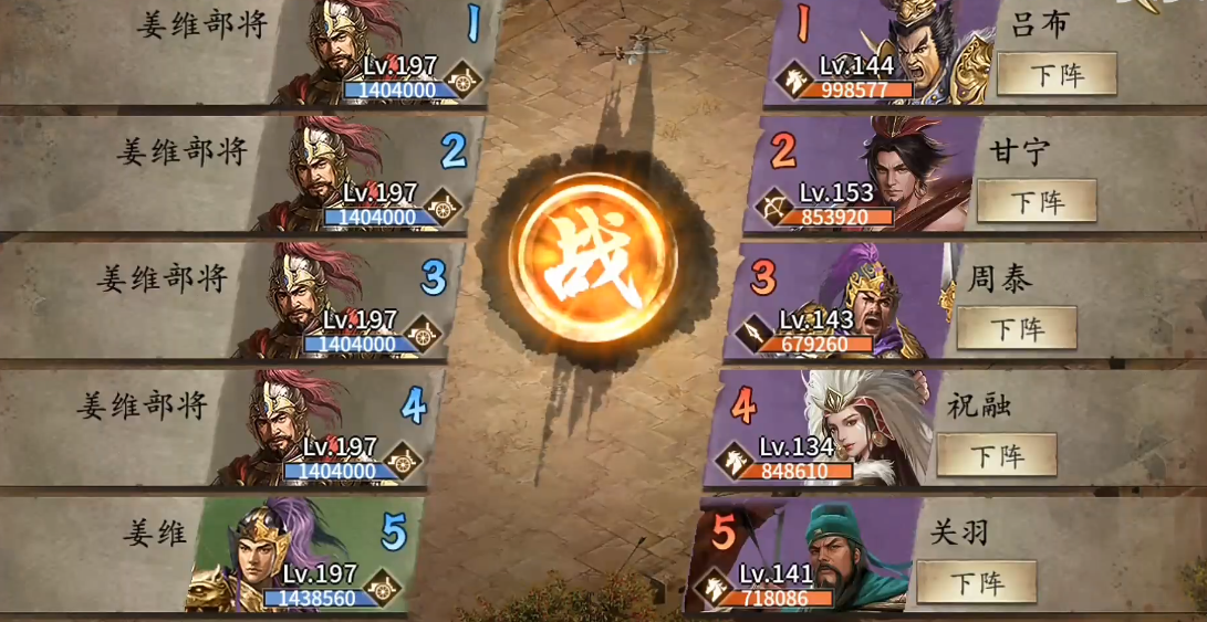 战斗过程中,许褚作为第二顺位武将,装备真驱虎套装开场释放战法,利用地势优势平砍输出。关羽排在第三位,战法释放时机至关重要,需保留至最后一刻以保护后排副将周泰和张飞。张飞作为收尾武将,装备真灼龙套装在关键时刻释放战法,直接秒杀姜维最后两排兵力。需姜维部将的兵种包含弓兵、骑兵和步兵,攻击方式多样且附带觉醒技能,能快速回复血量和提升防御,因此必须优先削弱其输出能力。