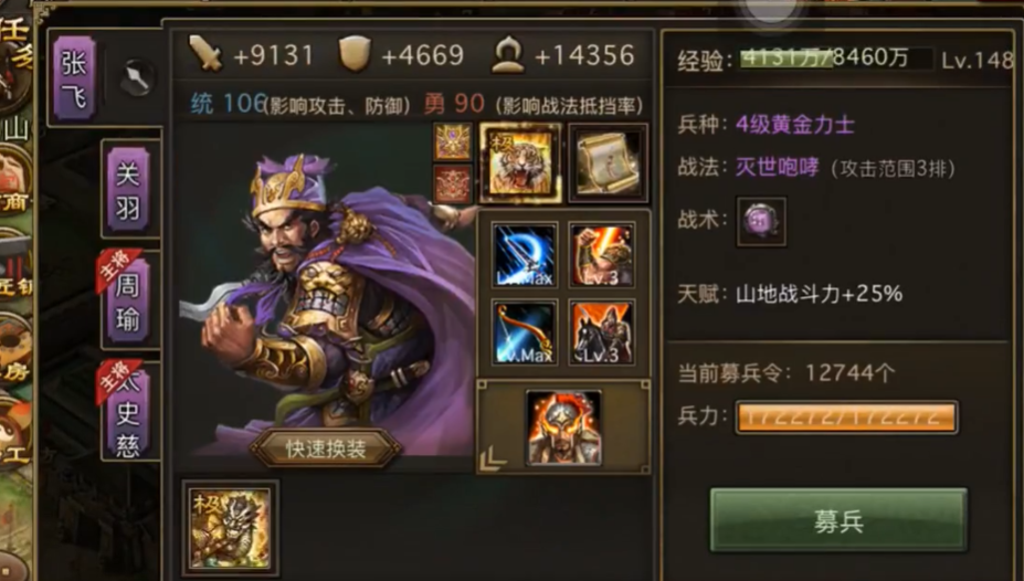 兵器建议左边全100级,右边至少87级以上,宝石推荐四颗13级镶嵌在攻击与血量属性上。武将选择需兼顾地形优势和战法爆发,太史慈作为主力输出需携带朱雀套装,其两次战法可有效削减敌方兵力。许褚适合穿戴驱虎套装增加带兵量,张飞推荐真霸下套装提升生存能力,周泰则需青龙套装发挥平原作战优势。