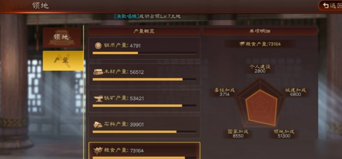 资源获取是游戏发展的核心要素,主要包括木材、石料、铁矿、粮食和铜币五种基础资源。这些资源通过多种途径稳定产出,合理规划资源获取方式能够显著提升发展效率。主城与分城的资源建筑是基础来源,农场、采石处、伐木场和冶铁台升级至满级后每小时产量可达15000单位,相当于11.5个五级资源地的产量。工坊是另一种高效设施,攻克7级资源地后即可建造,1级工坊即可提升所有资源500/小时的产量,满级后总加成可达10000/小时。