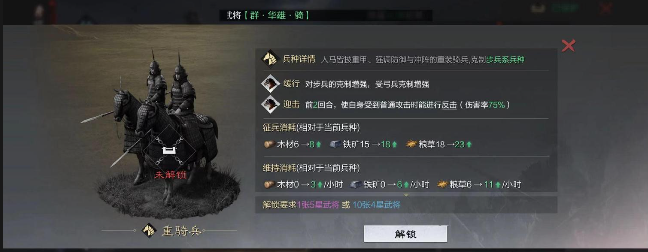 兵种转换后的资源消耗问题不可忽视。重骑兵的征兵物资、日常维持消耗均高于普通兵种,尤其在游戏中期资源产出尚未完全成型时,需评估主城资源产量能否支撑。建议优先为核心队伍中的防御型武将转换,避免盲目大规模转换导致资源链断裂。同时要注意,转换后的兵种特性与武将原有战法可能产生联动效果,例如反击特性搭配嘲讽类战法可形成战术闭环。