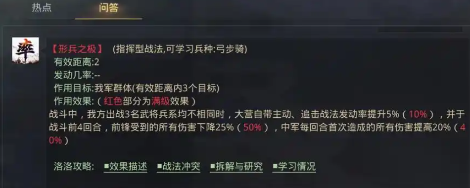 战法的合理运用是另一个重要角度,形兵之极这个战法能提升大营主动战法的发动率,并在前四回合为前锋提供减伤、为中军增加伤害输出,这能在战斗早期抵消孙策的突击优势;无心恋战是另一个强力选项,它能在前三回合大幅降低敌军的攻击和策略攻击伤害,在谋略属性较高时效果尤为显著,能迫使敌方组合在开局阶段难以建立有效的攻势。在搭配战法时,注意避免与己方指挥类效果冲突,以最大化减伤和控制收益。