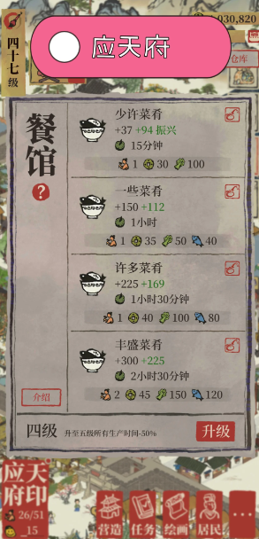 具体建造餐馆时,你需要进入营造菜单的生产分类,餐馆作为初始建筑无需额外解锁,直接选择合适地点放置即可。建造数量的把握需要根据游戏阶段灵活调整,在前期开荒阶段,由于资源消耗大且建筑等级不高,建议建造四到五个餐馆,并将每个平均升级到二至三级以保证基础产量。到了中后期,则应追求建筑的效率而非数量,可以精简为两个高等级餐馆,例如将一个升至满级五级用于即时生产,另一个维持四级用于储备,这样既能满足需求又能节约宝贵的城市用地。