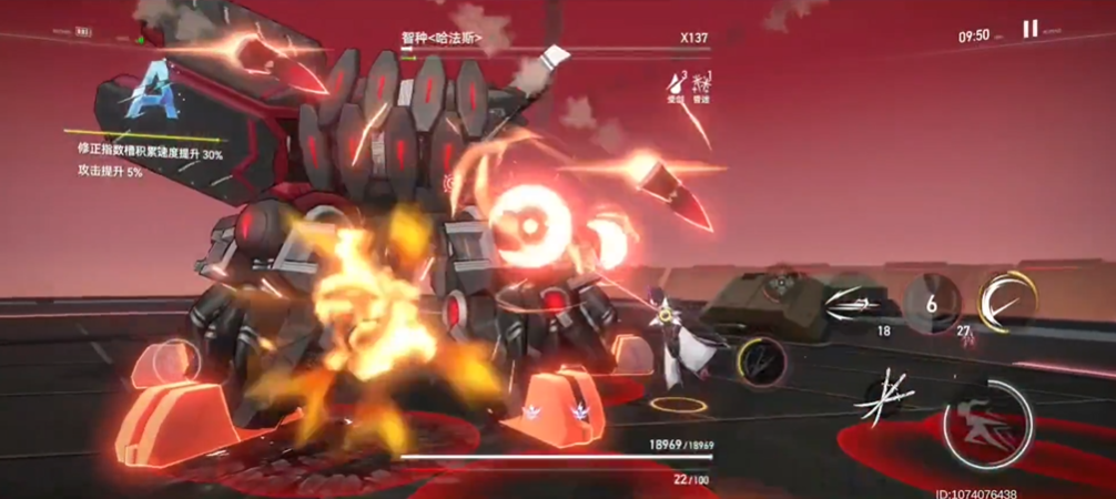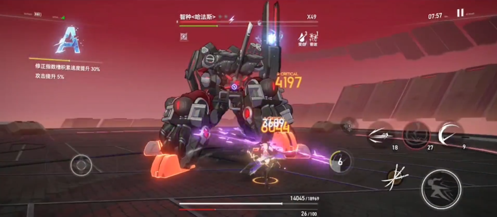 作为典型的堡垒机器人,哈法斯的战斗分为清晰的技能循环和模组强化阶段。它的主要攻击方式包括腿部炮击、火力倾泻、定点打击和蓄力激光。腿部炮击会进行瞄准,通过左右移动可以摆脱其锁定。一轮完整的攻击后,哈法斯会受到一定伤害并进入强化阶段,玩家可以选择破坏其新增的模组。第一次强化通常会在震荡炮装置和充能模组中选择,前者使炮击附带减速的扇形震荡波,后者则是提升炮击的发射频率,两者都显著增加了躲避的难度和风险。第二次强化则会进一步加强第一次的效果。战斗中的关键是在第一次强化时,根据你的队伍特性选择破坏对你威胁最大的模组,比如为近战角色优先破坏震荡炮装置。