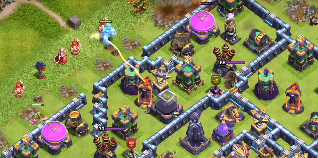 70级是女王的终极质变,属性迎来全面爆发,高额生命值与单体伤害让她具备单挑高等级大本营与核心防御的能力,面对天鹰火炮、地狱塔、多头塔等顶级防御时,能凭借技能隐身与高伤害快速突破,即便没有天使辅助,也能在狂暴、治疗法术加持下完成单点爆破,联赛与传奇杯对局中,70级女王可独立处理敌方半区防御,大幅降低大部队作战压力,配合克隆、狂暴等法术,能实现单英雄摧毁核心区域的战术效果。