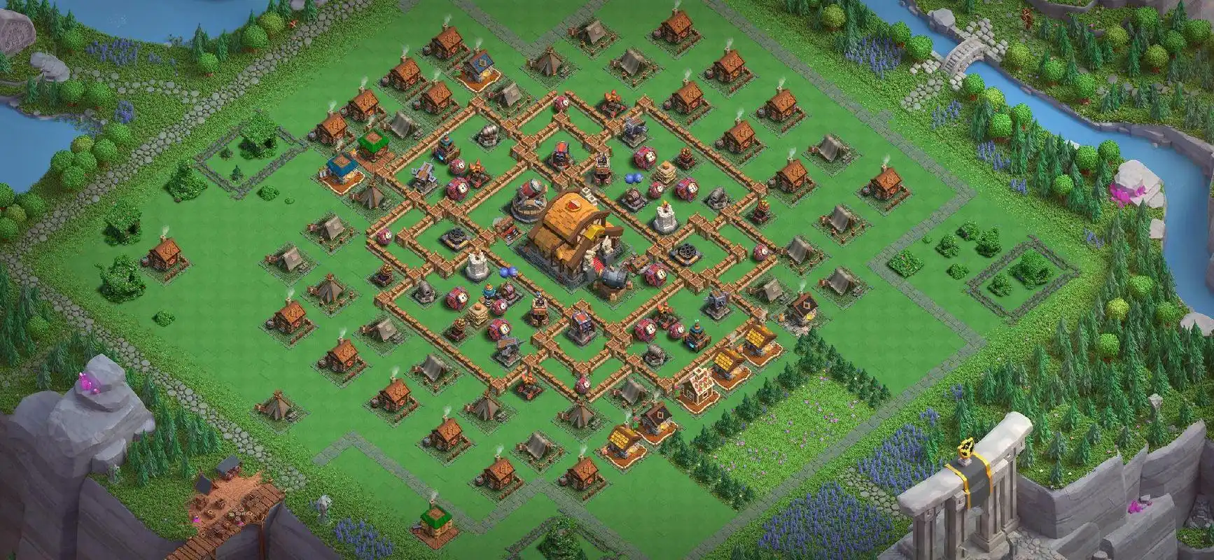 陷阱与英雄技能的布局使用是进攻布局的细节关键,进攻前要预判弹簧、巨型炸弹、骷髅陷阱的位置,用小单位探路,比如用野蛮人、弓箭手踩弹簧,用气球探巨型炸弹,避免主力踩陷阱减员;英雄技能要卡准时机,女王残血开隐身保命,蛮王开技能冲锋破墙、清理密集防御,大守护者开金身保护主力扛住爆发伤害,闰土用回溯调整走位、补刀残血核心建筑,收尾阶段用剩余兵种清理边缘建筑,确保百分比与星级达标,同时根据阵型调整细节,比如对称阵选单侧主攻、不对称阵选薄弱角突破,密集阵用弹跳+狂暴快速破局,分散阵用分兵清边再合围。
