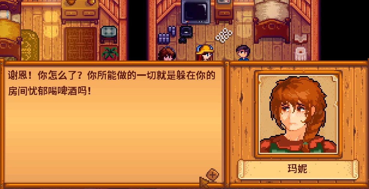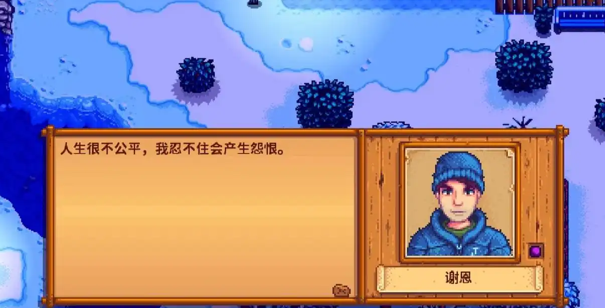 2心事件是了解谢恩背景的重要开端,需在晚上8点至凌晨12点进入煤矿森林。他会分享啤酒并倾诉对生活的消极态度,玩家饮酒会恢复体力但获得眩晕效果。4心事件分为两部分:其一是醉酒后表达轻生念头,需在玛妮牧场用水浇醒他;其二是通过邮件收到食谱奖励。6心事件在雨天触发,谢恩会因抑郁情绪试图跳崖,玩家需通过对话引导他接受治疗,此事件直接影响后续剧情走向。